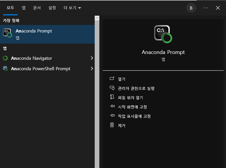 2. 아나콘다 프롬프트 창에서 아래와 같이 명령어를 입력