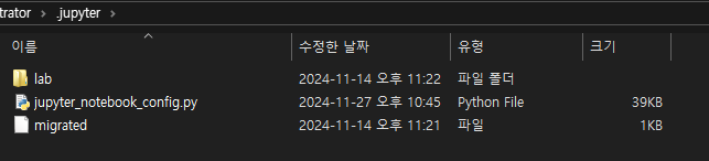 입력한 명령어 아래 줄에 출력된 경로에 jupyter_notebook_config.py 설정 파일 생성됨