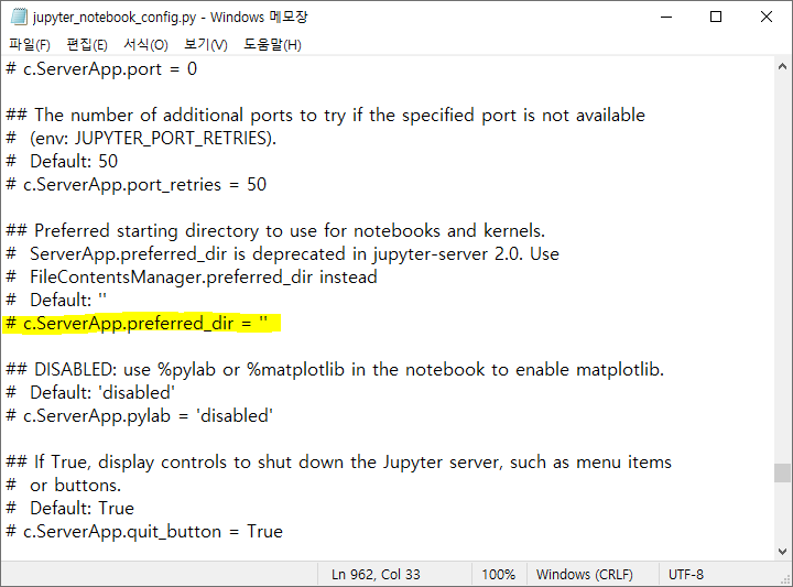 위 사진과 같이 # c.ServerApp.preferred_dir = '' 부분 찾기